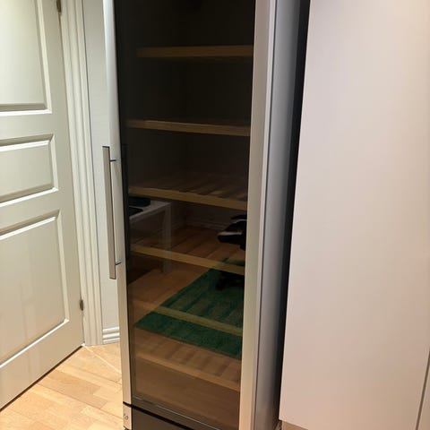 Nyt sort støjsvagt køleskab med røgfarvet glasdør højre eller venstre vendt …ingen buler eller ridser, har kun været i brug 2 md.(fejlkøb)
