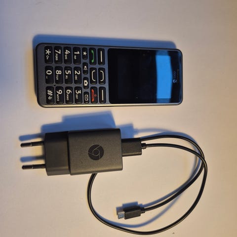 Doro 530X trykknap telefon intakt med opladningsfod og kabel, samt headset. Ældrevenlig mobil eller til dig, der ønsker en helt simpel telefon uden wi-fi. Ideel til telefon detox.