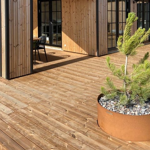 Frøslev Embla® ThermoWood fyr er thermobehandlet træ. Træet varmes nænsomt op til høje temperaturer over 200° C, samtidig med at der tilføres vanddamp. Processen gør at træet opnår en varm mættet farve, og det bliver særdeles formstabil samt modstandsdygtigt overfor råd og svamp. Frøslev Embla® ThermoWood har en levende overflade med et smukt, varieret knastbillede, der ser flot ud på terrassen. ThermoWood fyr kan stå ubehandlet og vil med tiden patinere til en flot sølvgrå farve.