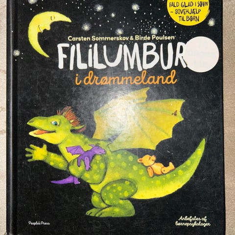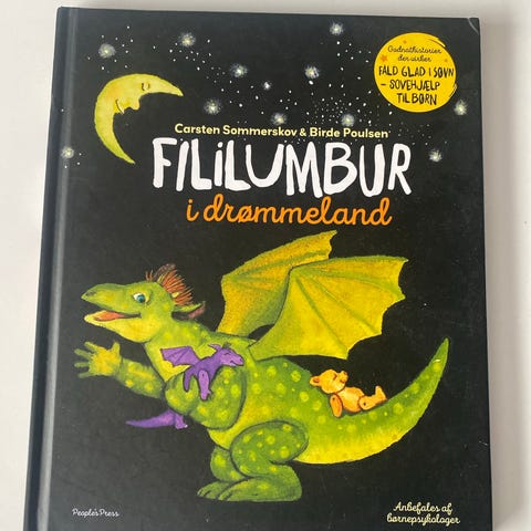 Fililumbur børnebog med rød omslag. Bogen handler om dragen Fililumbur og henvender sig til børn. Indeholder illustrationer og tekst på dansk.