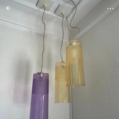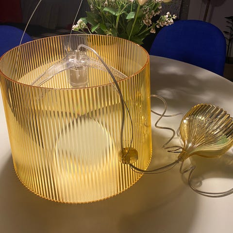 Flotte og stilrene loftlampe fra italiensk design Kartell. Cylindrisk form i transparent orange og violet farver.