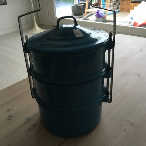 Spand i 2 lag. 19,5 cm høj incl låg. Knap 21 cm i diameter
