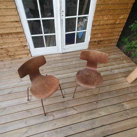 Fremstår med alders- og brugsslitage, herunder ridser, mærker, hak, finerskader og rust. Blød i ryggen og knækket. Bemærk at stolen har været malet.