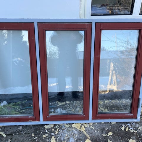 Retro vinduesparti i real med termoglas og ramme i hvid farve og teak udadtil. Passer til installation i bolig eller bygning. Består af to store glaspartier med tilhørende rammer og håndtag.