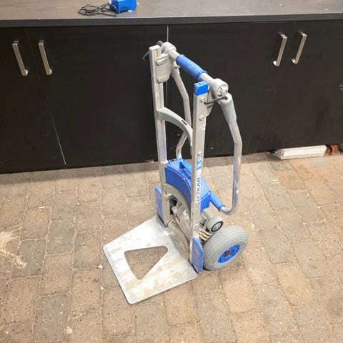 Stannah 260 trappelift med sæde i rød og hvid. Trappeliften er designet til transport op og ned ad trapper og kan bære en person med en vægt op til 120 kg. Den er monteret på en bøjelig skinne, der følger trappens form. Sædet har armlæn og fodstøtte for komfort og sikkerhed under brug.