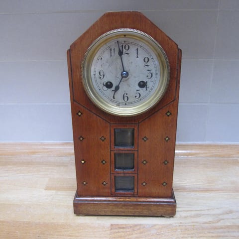 Uret har arabiske tal og klassiske visere samt dekorativ trækasse. Der er låge bagpå for adgang til mekanismen.