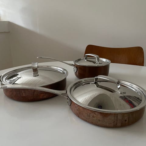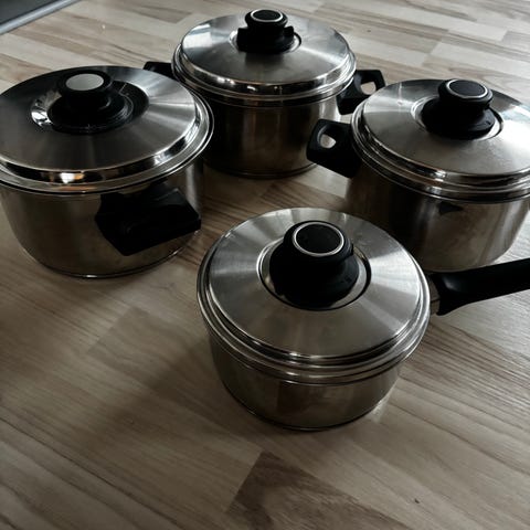 Fremstår pæne. Gryderne har ikke været brugt på gas og er alle plane på bunden.