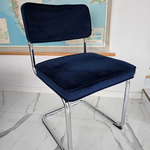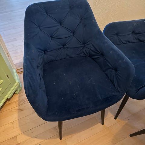 7 stk velholdte blå spisebordsstole i blå velour med sorte metalben - købt i Hebru Haderslev d. 2. November 2023 (Kvittering haves).