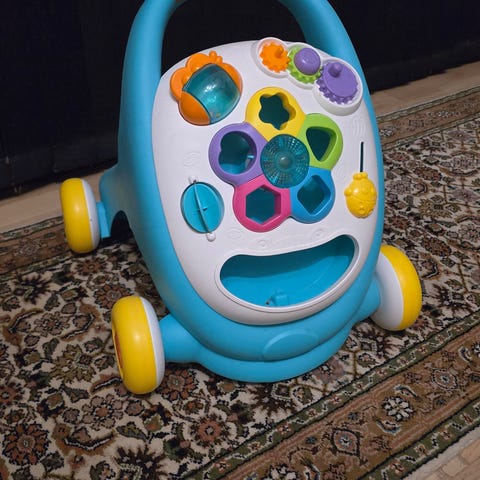 Fin gåvogn med klodser. Hjulene har lidt modstand så vognen ikke kører for hurtigt.