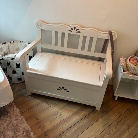 IKEA opbevaringsbænk i sort farve med polstret sæde med stribet mønster. Bænken har en praktisk opbevaringsfunktion under sædet og er velegnet til opbevaring i forskellige rum.