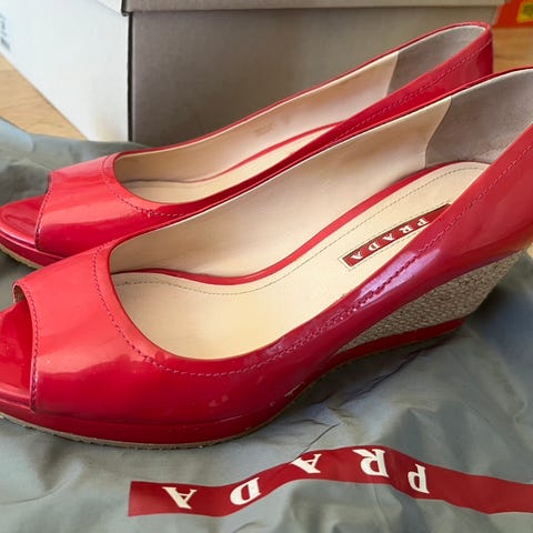 Prada festsko i størrelse 36. Skoene er brune med dekorative detaljer foran. Designet til formelle lejligheder. Hælhøjden er cirka 2 cm. Skoen er helt ny og ubrugt.