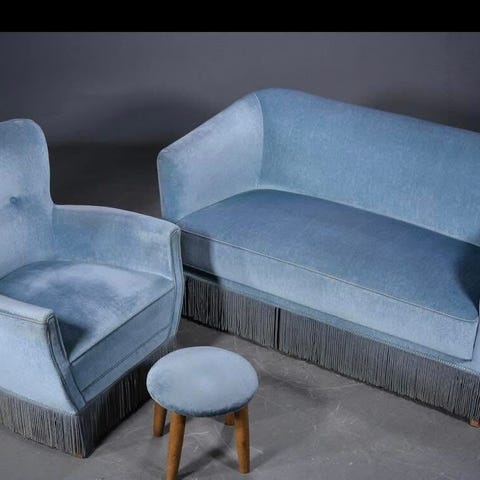 Møblerne er betrukket med brokadestof i lys gul med abstrakt mønster.
