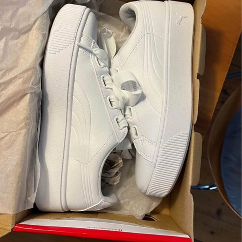 Puma Vikky Platform sneakers i sort ruskind med hvid stribe og gummisål. Puma sneakers i størrelse 40 med sort overdel, hvid detalje og brun sål. Skoene er designet til hverdagsbrug og har snørebånd.