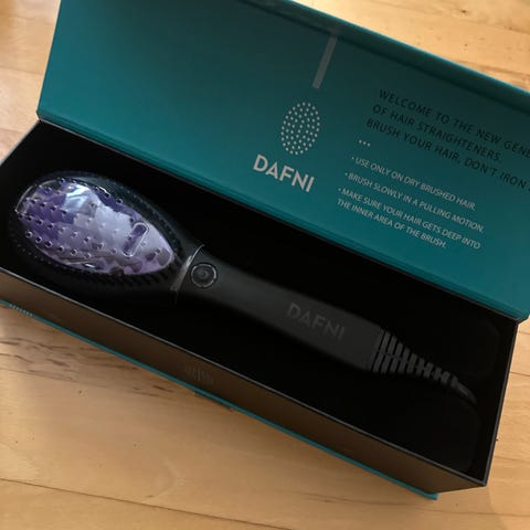 Hårbørste i sort lilla. Elektrisk børste til at glatte hår, med ergonomisk håndtag og keramiske børster.