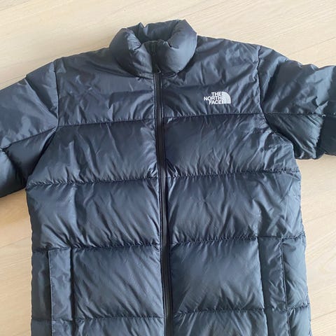 Dunjakke, The North Face, str.S/P, mørkeblå, aftagelig hætte, super dejlig og varm jakke, brugt kun 2 gange og er som ny.