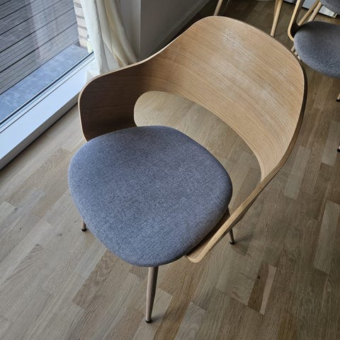 Jeg sælger otte af disse super flotte spisebordsstole udført i lys eg fra JYSK.😊 De er velholdte og fremstår med mindre brugsspor.