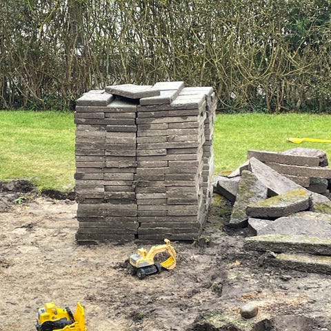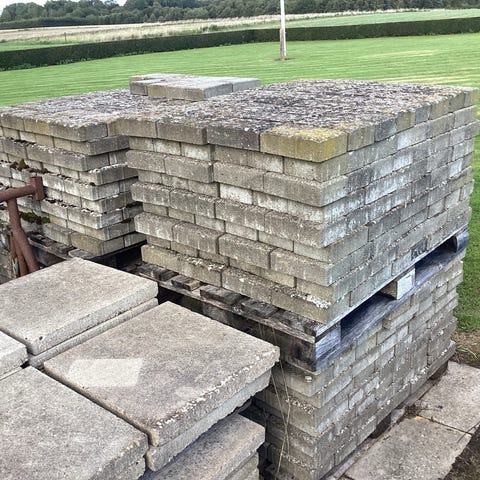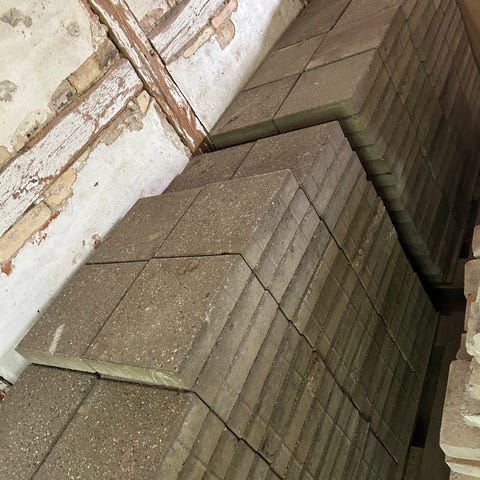 Cirka 40 m² fliser tykkelse 6 cm. 20 × 40 og en sort på 20 × 20 det giver modul på 60 × 60 cm.