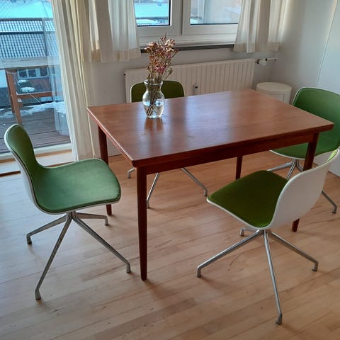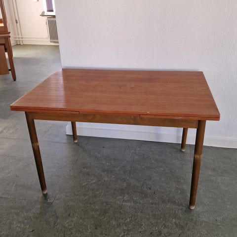 Praktisk spisebord med hollandsk udtræk. Meget komfortabelt til 4 personer, eller op til 8 personer med plader udslået.