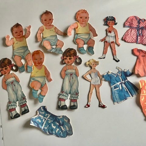 Påklædningsdukker, babyer i kraftigt karton med en del tøj.