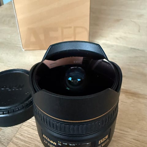 Objektivet er et full-frame 180grader fisheye til FX kameraer. Kan bruges på DX format (107 grader) Dæksler og kasse følger med. Helt som nyt.