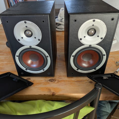 Spiller langt større end hvad man skulle tro. Specielt hvis de bliver hængt op på væggen via det indbyggede nøglehulsbeslag så den sidder helt tæt. Dette forbedrer lyden markant.