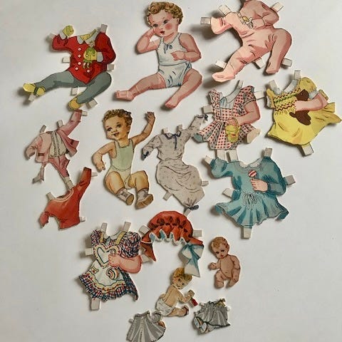 Blandede påklædningsdukker i kraftigt karton.