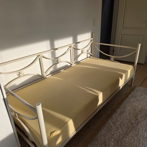 Sengen har en boxmadrasse og topmadrasse. D. 90X B. 210 X H 100 cm.