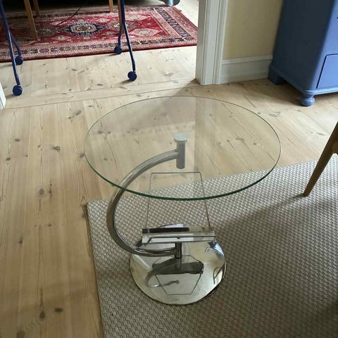 Glasbord, Dansk design, Shattered glass table b:43 x l:75 x h:45 helt unikt glasmønster, består af 3 lag hærdet glas limet sammen, hvor midterste glas bevidst er krakkeleret og holdes på plads af helt glas under og over. Sølv alustel / profiler. Der er klargjort til evt. bundhylde. Benyttes som sidebord, sofabord el. lign. Superfin stand