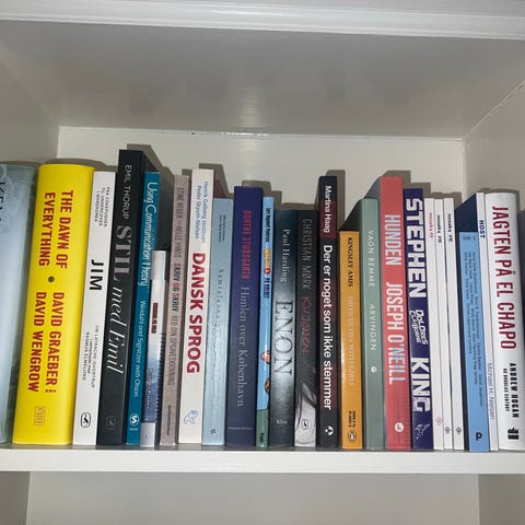 Blandet udvalg af bøger inden for forskellige genrer og emner. Bøgerne varierer i størrelse, farve og forfattere. Velegnet til læsere med interesse i skønlitteratur, faglitteratur og sprog.