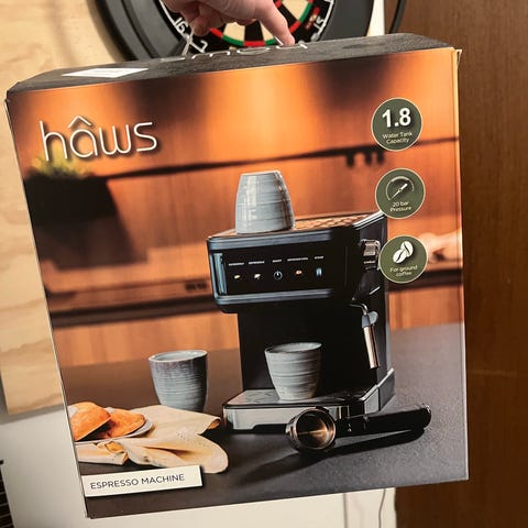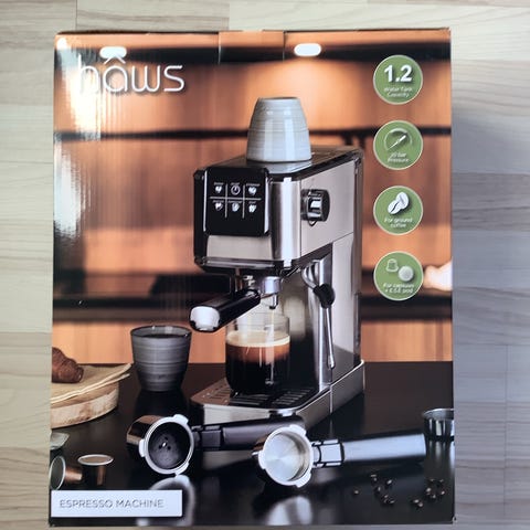 Hâws Espresso Maskine med en aftagelig vandtank på 1,2 liter og steamerfunktion. Maskinen har flere tilbehør, herunder forskellige filterholdere og tamper. Designet i rustfrit stål med sort finish. Velegnet til tilberedning af espresso og kaffevarianter. En firmagave som vi ikke får brugt da vi allerede har en.