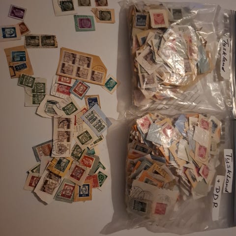 Bunke af hundredevis af frimærker hovedsageligt 60 øre Byd. Kan hentes i Randers eller skal