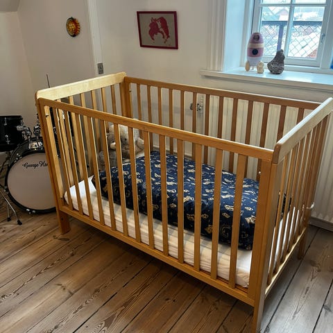 Sengen er i meget fin stand med minimale brugsspor. Bunden kan justeres i 3 højder, så sengen nemt kan tilpasses barnets alder og behov. (pris. 1399)