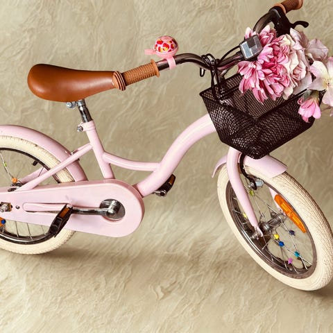 STOY børnecykel med 16 tommer hjul, lyserød ramme og brun sadel, med tilkøbt kurv. Støttehjul medfølger også. Cyklen har stået inde altid og der er derfor intet rust og den fremstår derfor i rigtig god stand, som kan ses på billederne.