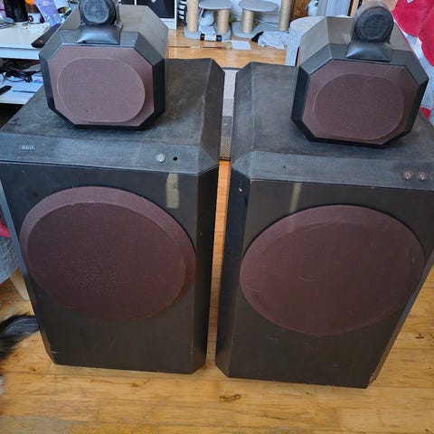 De står flotte, dog med lidt brugsspor på kabinetterne. Enhederne er virkelig flotte, og de spiller fantastisk. Har tidligere brugt dem som mine primære højttalere, men efter at have fået nye og dem her har stået opbevaret et halvt år tænker jeg nu at sælge dem for at få mere plads, selvom jeg er meget glade for dem.