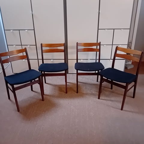 ARNE WAHL IVERSEN. Et par stole af palisander, sæder betrukket med stribet uldstof, Glyngøre Stolefabrik, Danmark. Tilspidsede ben. Med brugsspor