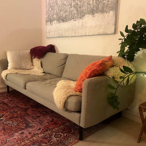Sofaen fremstår som ny og er meget lidt brugt. Stoffet er meget slidstærkt i nuancerende brun. Sofaen er utrolig behagelig og smuk. Tegnet af en italiensk arkitekt, husker ikke hvem. Må nok betegnes som et fejlkøb til vores hus.