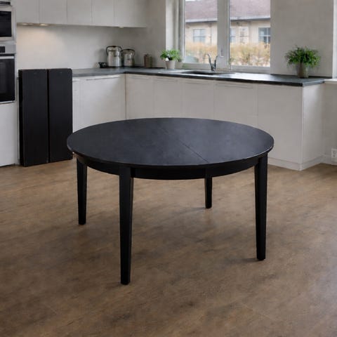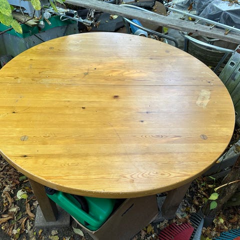 Rundt spisebord med 8 matchende stole i træ. Bordet har en rund form og er velegnet til spisestue eller køkken. Stolene har ryglæn og siddepladser i træ.
