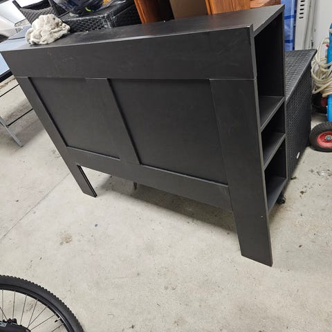 Der er savet 15 cm af fødderne i bunden, da den skulle stå under en skråvæg, men den passer stadig fint sammen med Brimnes sengen og man kan ikke se det. Målene er derfor H96cm x B166cm x D28cm (se sidste billede).