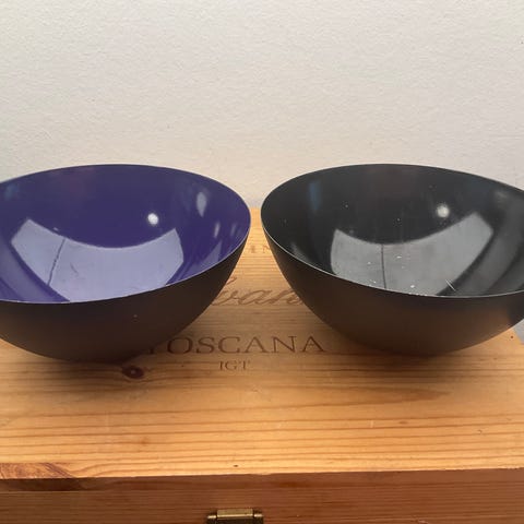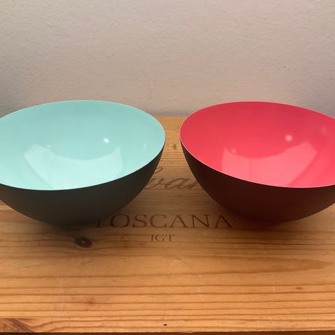 Normann Copenhagen skåle sæt bestående af to skåle i blå og grøn farve. Skålene har en enkel og funktionel design, velegnet til brug i køkkenet til servering eller opbevaring af mad.
