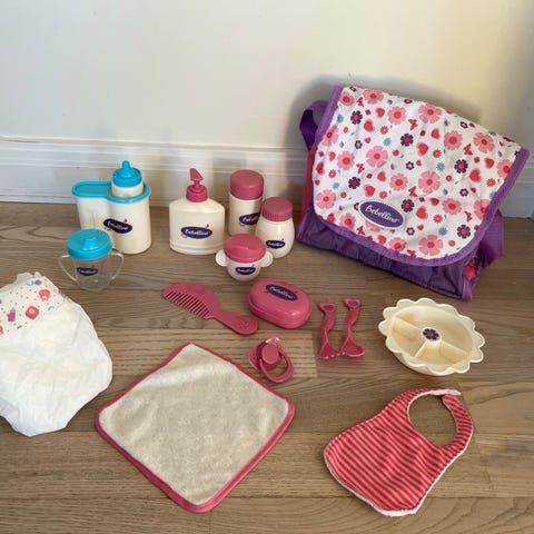 Pusletaske med tilbehør, til babydukke. Fra ikke-rygerhjem.