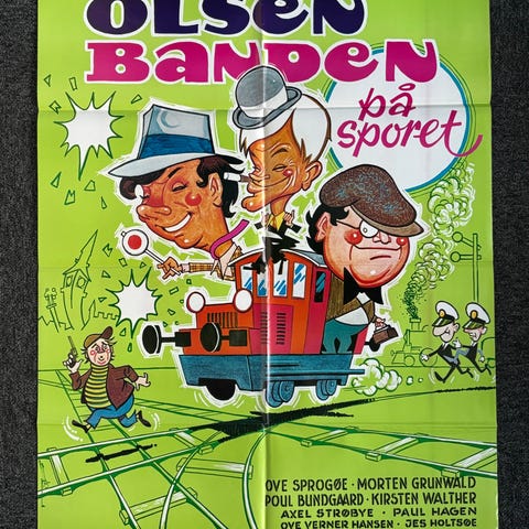 Sæt med tre Olsen Banden filmplakater med motiver fra filmene 'Sidste stik', 'Store kup' og 'Deruda'. Plakaterne har forskellige farver og illustrationer med karaktererne fra filmene.