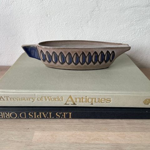 Keramik kande med hank, dekoreret med mønster i brunt og hvidt. Kanden har en rund form og en åbning i toppen. Materialet er keramik, og farverne er primært brune med hvide detaljer. pr. stk. 75.-