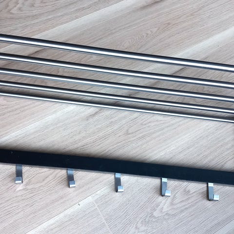 Vægmonteret IKEA TJUSIG hattehylde med integreret knagerække. En praktisk og stilren løsning til entré, gang, soveværelse eller bryggers. Det enkle, skandinaviske design kombinerer en solid sort metalramme med stænger i rustfrit stål, som gør den robust og velegnet til daglig brug.