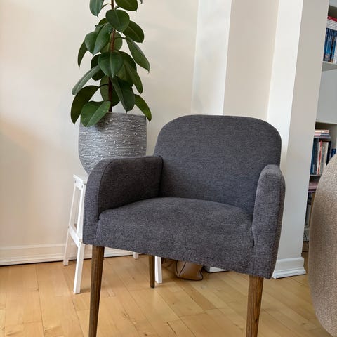 Mossroom C-Moon stol i stof med mørk bejdset ben i eg.