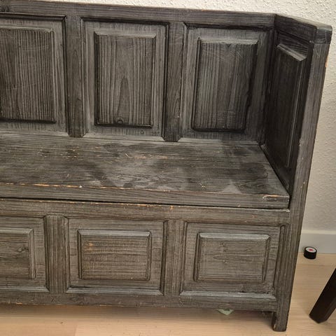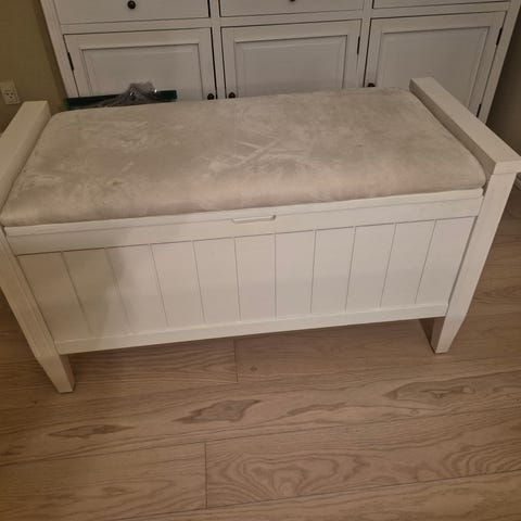 Opbevaringsbænk med 2 store rum indeni og tilhørende grå hynde. Malet.