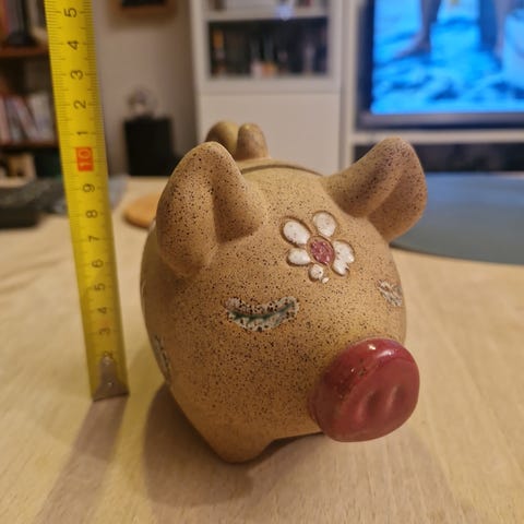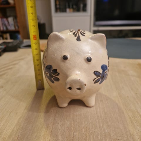 Keramisk sparegris formet som en regnbue med farverne pink, rød, gul, grøn og blå. Sparegrisen har en åbning til mønter på toppen og en gummi prop i bunden så man kan tømme den.