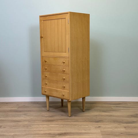 Grundet flytning skal vi desværre af med dette flotte væghængte skab, som er massivt egetræ med spotlys i alle 4 skabe.