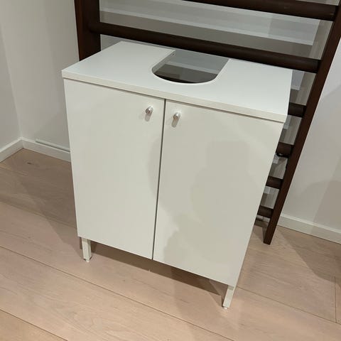 Badmiljø / underskab i trælook med to skuffer. Materialet er trælook, som giver et naturligt udseende. Blandingsbatteri følger med.