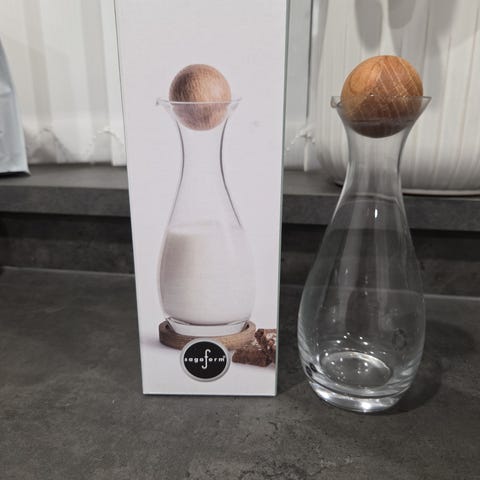 3 glas flacon'er samt salt og peber strøer med trækugle som prop + bræt med skåle