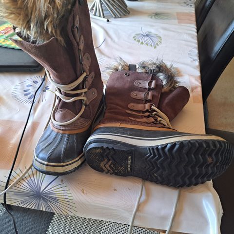 Sorel dame vinterstøvler. Støvlerne har en sort farve med pelsdetaljer øverst og en gummisål. Materialet og designet er egnet til at holde fødder varme og tørre i koldt vejr. Str 41,5. Små i str bruger normalt str 40